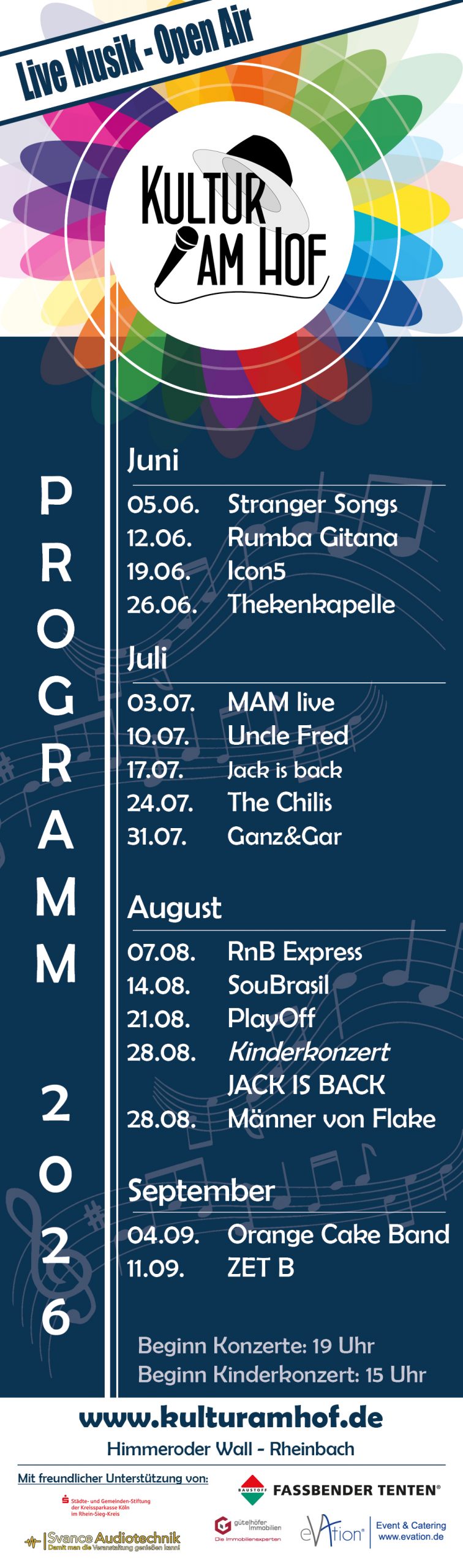 Die Konzerte veranstaltet die Stadt Rheinbach in Zusammenarbeit mit Maria Jansen, die seit 2019 die Koordination dieser erfolgreichen Reihe übernommen hat. Unterstützt wird Maria bei der Organisation und Durchführung der Konzerte vom Kultur am Hof-Team, bestehend aus Stefan und Birgitta Raetz, Michael Firmenich und Andrea Richter.